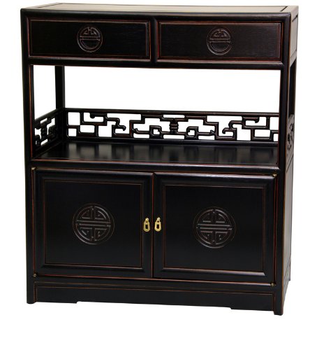 Choose antique black, the dark Rosewood, or the two-tone Rosewood finish. An authentic Ming dynasty design oriental tea chest, crafted from fine quality kiln dried Rosewood, with floating panel construction to tolerate changes in seasonal humidity. The carved Shou medallions on the cabinet doors were thought to attract good influences, and encourage the long life of the owner. Designed to store tea in the top drawers, teapots and cups in the bottom, and for serving tea from the center. Beautiful hand carved geometric decoration on three sides of the center. A unique, distinctive accent for a beautifully decorated room, from a large collection of fine Chinese Rosewood decorative furniture, wall art, and decorative accessories, on Amazon.com. Orders ship next business day, professionally packed fully insured from our Massachusetts warehouse via Fed Ex, with expedited delivery available.